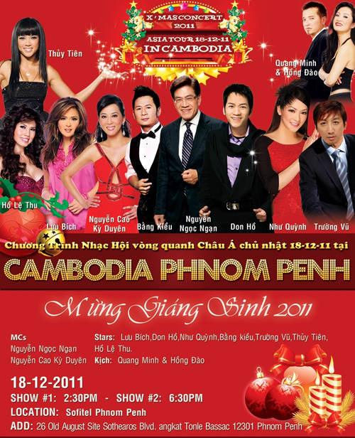 Chương trình “Nhạc Hội Vòng Quanh Châu Ávới sự tham dự của: MC Nguyễn Ngọc Ngạn – Nguyễn Cao Kỳ Duyên; Casỹ đến từ hải ngoại như Lưu Bích; Don Hồ; Như Quỳnh; Bằng Kiều; Trường Vũ; Thủy Tiên; Hồ Lệ Thu… tại khách Sạn 5 sao – Sofitel Phnompenh.